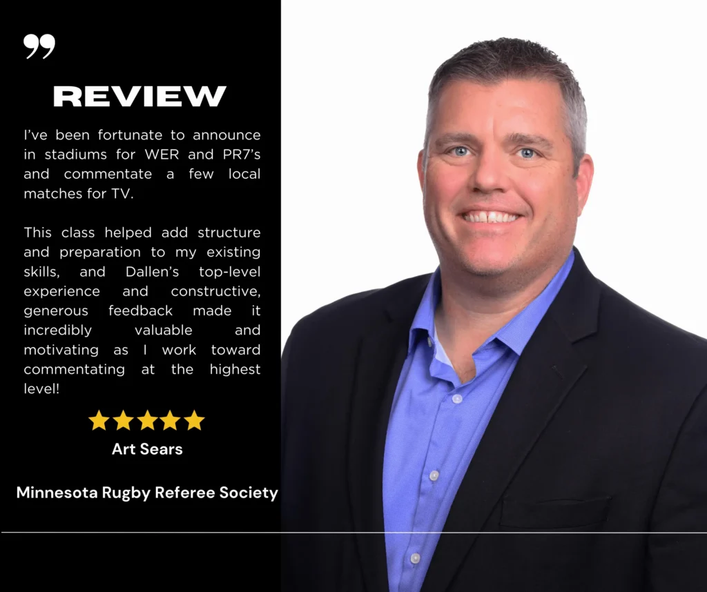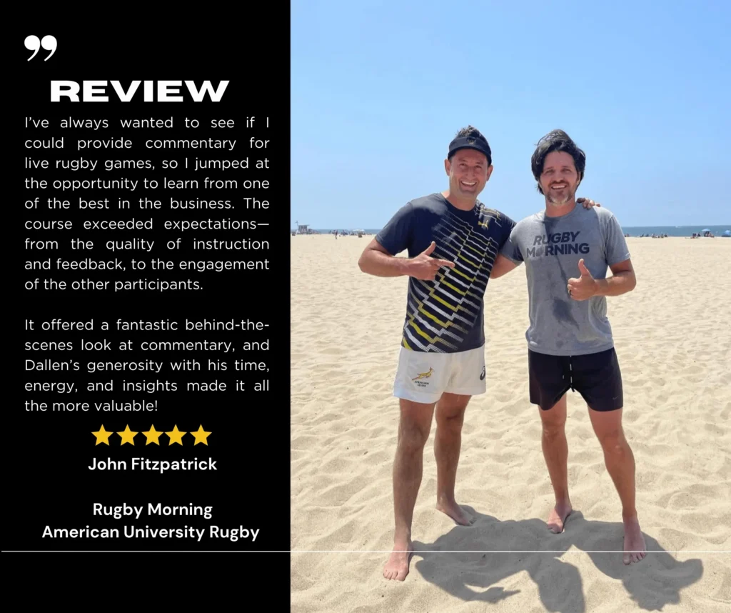 This beginner-friendly course teaches the core fundamentals of rugby commentary, making it perfect for new commentators who want to turn their passion into performance.